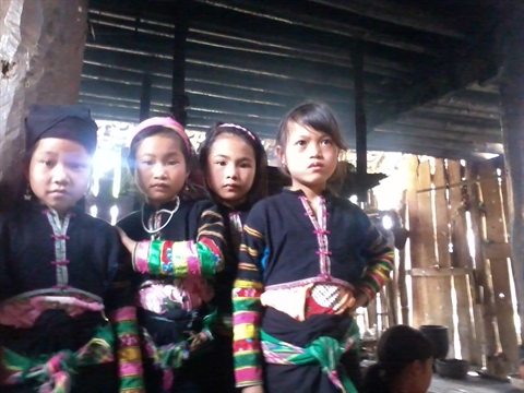 Après avoir profité quelques très belles photos, nous descendons au village toujours par le beau chemin en terre. Dès l’entrée du village, il y a déjà un groupe de petits Lolo qui nous attendent en lançant le mot “bonjour” avec de très beaux sourires (je crois qu’ils nous ont retrouvés de loin). À notre tour, nous répondons aux enfants en souriant. Voilà c’est le premier sympathique contact avec les habitants du village.
