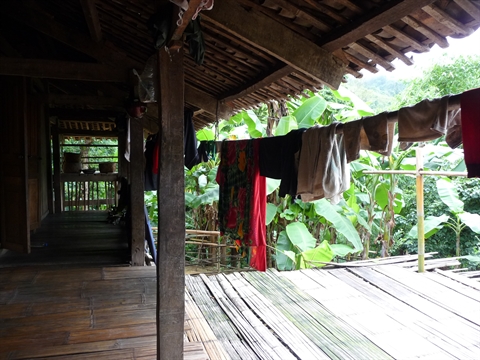 En attendant les autres qui se lavent, après 3 heures de marche difficile, je fais le tour de la maison pour l’admirer ou bien pour comprendre la vie des habitants ici. Cette maison est située sur une bonne place avec un beau jardin potager derrière et une belle vue avec une terrasse en bambou devant. En haut, sur pilotis, c’est le coin de la famille pour faire la chambre à coucher, la cuisine, et même le stockage de produits agricoles. En bas, il y a des places pour les bêtes (buffles, vaches, …), les outils d’agriculture (faucille, hache, charrue, …) et la propre cuisine pour les bêtes, quel honneur !