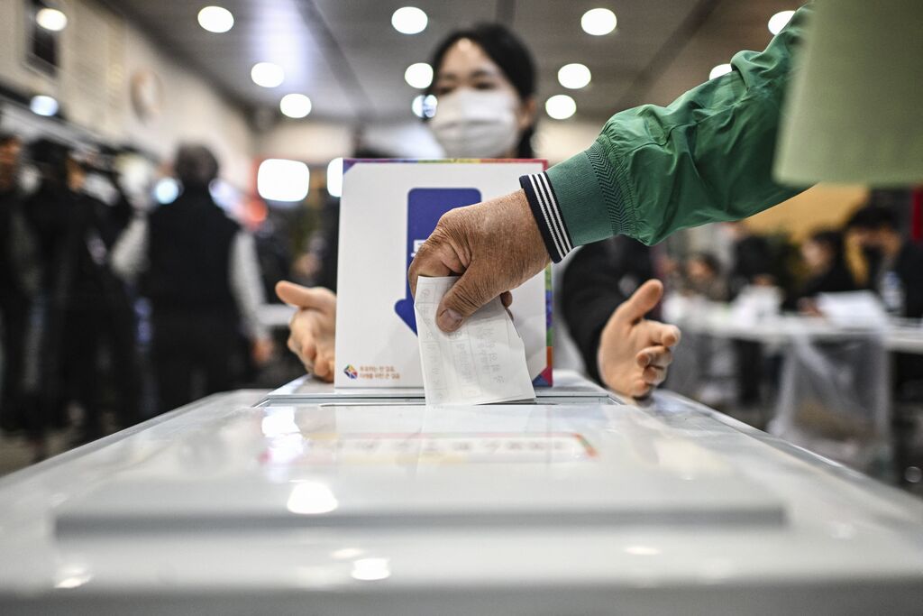 | Dans un bureau de vote à Séoul, le 10 avril. |