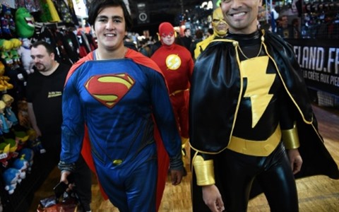 | Des particpants au salon "Comic Con" habillés en Superman (gauche, Flash (centre) et autres héros de BD, à la Grande Halle de la Villette, le 21 octobre à Paris. |