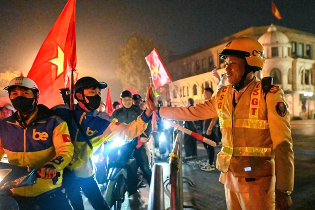 | La police de la circulation était elle aussi de la fête avec les supporters hanoïens. |