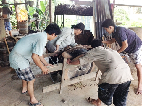 Le village de fonderie de métaux de Phuoc Kiêu, district de Diên Bàn, province de Quang Nam, a été choisi pour fondre les caisses. «Au début, j’ai dû jeter un certain nombre de tambours qui sonnaient faux, avoue-t-il. Il suffit de désaxer la note d’un millimètre seulement pour que le son soit incorrect». Beaucoup d’argent et d’efforts sont ainsi partis en fumée pendant de longs mois, avant que l’artisan ne réussisse à façonner des tambours aux bonnes tonalités.