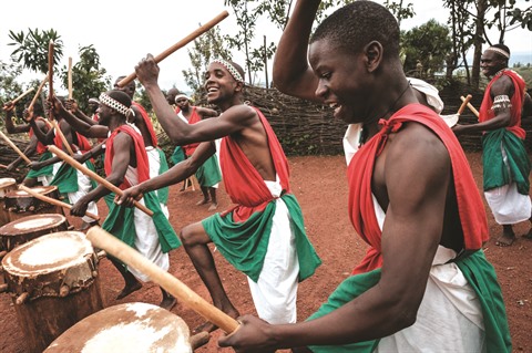Pieds nus sur la terre ocre, les artistes - silhouettes athlétiques drapées des couleurs du Burundi - frappent la peau puis les flancs sourds de l’instrument, chantent, virevoltent, avec pour décor les collines innombrables de ce pays d’Afrique des Grands Lacs.
