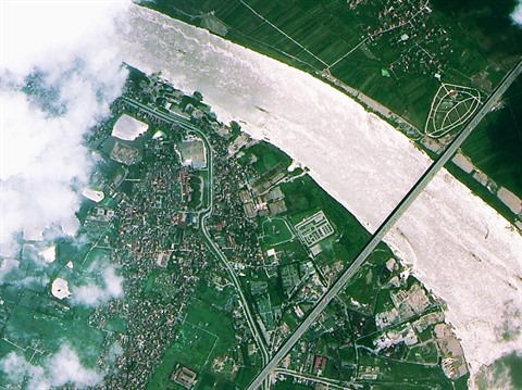 | Image du pont Thanh Tri (Hanoï), produite par le satellite de télédétection VNREDSat-1 en 2013. |