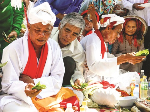 | Le prêtre en chef Po Adhia (gauche) tient la chique de bétel vers la tour pour envoyer les vœux et souhaits des croyants aux divinités. |