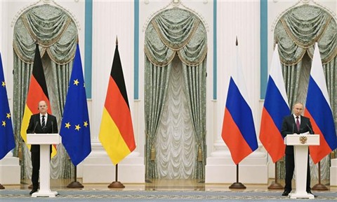 | Le président russe Vladimir Poutine (droite) et le chancellier allemand Olaf Sholz à Moscou, le 15 février. |