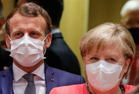 | La chancelière allemande Angela Merkel et le président français Emmanuel Macron à Bruxelles pour un sommet sur le plan européen, le 18 juillet. |