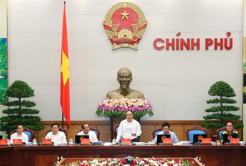 | Le Premier ministre Nguyên Xuân Phuc (debout) lors de la réunion du gouvernement sur l'élaboration des textes juridiques, le 23 juin à Hanoi. |