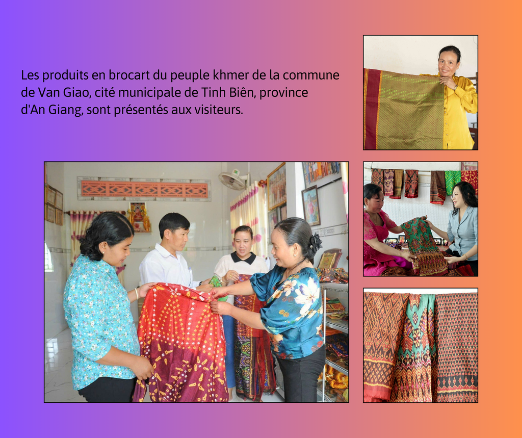 Les produits de brocart khmer de Van Giao sont disponibles sur les marchés nationaux et internationaux sous la marque "Silk Khmer". Ils ont été exportés vers la Thaïlande, le Cambodge et le Myanmar. Certains produits haut de gamme s’adressent aux touristes d’Europe, du Japon, de la République de Corée et d’Australie.