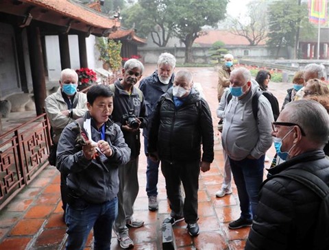 | Des touristes étrangers au Temple de la Littérature, à Hanoï. |