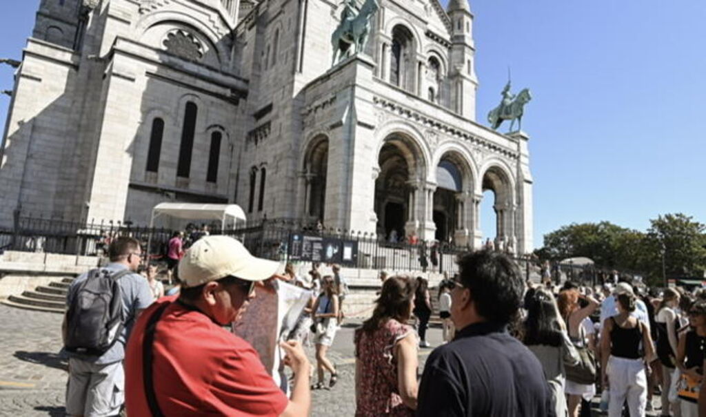 | Des touristes se rassemblent devant la basilique du Sacré-Cœur dans le quartier de Montmartre à Paris. |