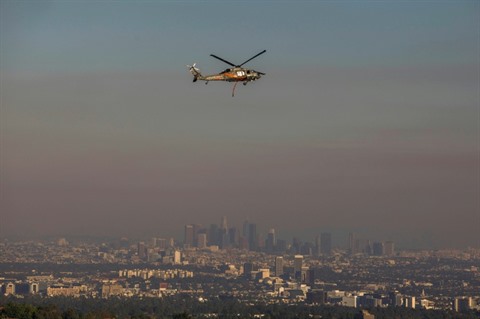 | Un hélicoptère des services de secours survole Los Angeles lors d'incendies touchant les collines de la ville, le 28 octobre 2019. |