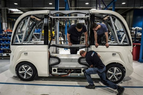 | Fabrication d'un minibus autonome à l'usine Navya de Bron près de Lyon, le 23 avril. |