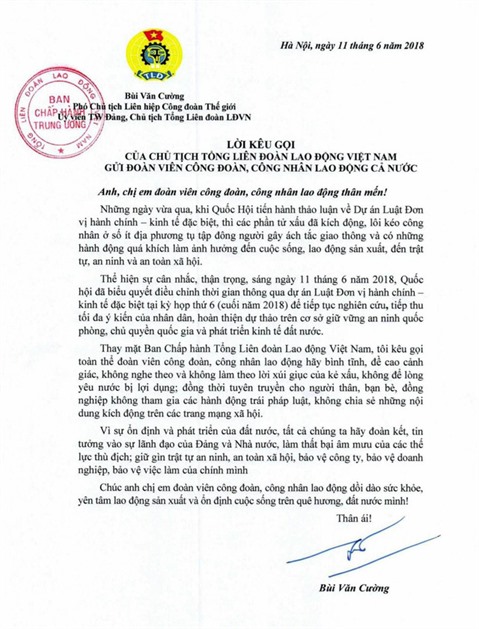 | La lettre du président de la CGTV, Bùi Van Cuong, adressé aux travailleurs. |