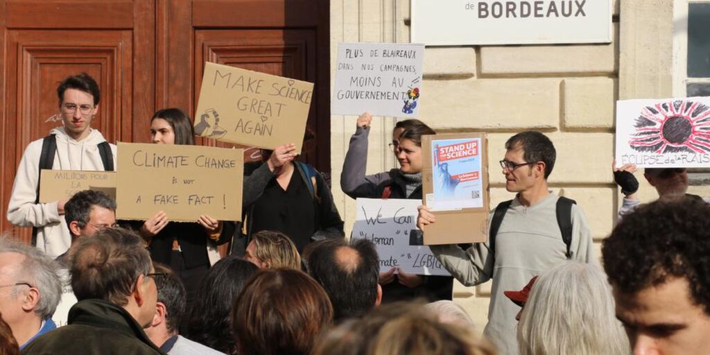 | Face à la politique de Donald Trump, le milieu scientifique s’est mobilisé place de la Victoire à Bordeaux, le 7 mars 2025. |