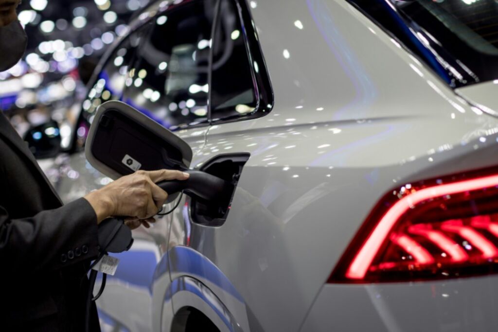 | Un homme branche un véhicule électrique à Bangkok le 22 mars. |