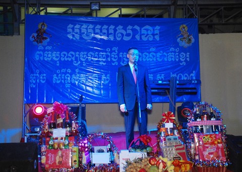 | Vu Quang Minh, l'ambassadeur du Vietnam au Cambodge, prend parole lors de la rencontre à l’occasion de la fête Chol Chnam Thmay, le 7 avril à Phnom Penh. |