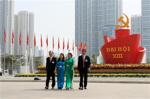 | Des délégués participant au XIIIe Congrès national du Parti, à Hanoï. |