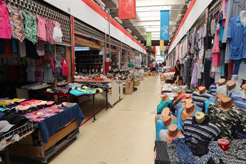 | Les stands de marchandises des commerçants vietnamiens au marché Dragonul Rosu à Bucarest. |