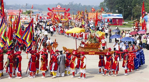 La cérémonie la plus imposante, la fête ancestrale de commémoration des rois Hùng, est célébrée pendant près d’une semaine au début du troisième mois lunaire. Les villageois des alentours revêtent de splendides costumes et participent à une compétition du plus beau palanquin et des objets cultuels les plus précieux pour le rite principal, pour lequel ils vont au temple principal en procession avec tambours et gongs.