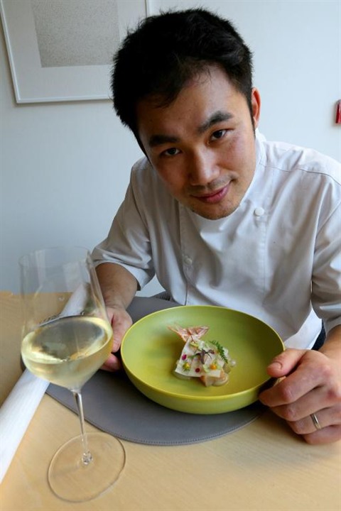 | Kazuyuki Tanaka dans son restaurant "Le Racine", à Reims le 10 mars. |