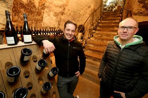 | Les cavistes Cédric Pilot (gauche) et Fabrice Parisot dans la "Cave du forum", à Reims le 10 mars. |