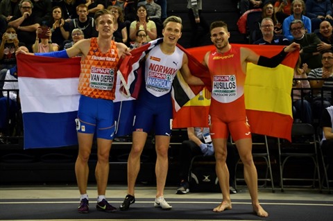 | Le Norvégien Karsten Warholm (centre) égale le record du monde du 400 m lors de l'Euro d'athlétisme de Glasgow le 2 mars 2019. |