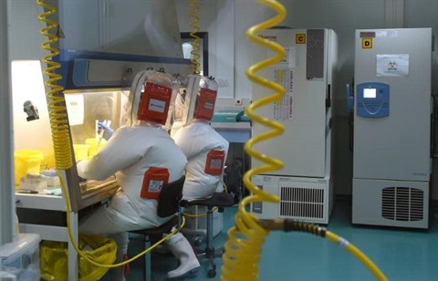 | Une équipe médicale en plein travail le 11 mai 2015 dans une nouvelle aile du laboratoire BSL-4 de l'Inserm (Institut national de la sante et de la recherche medicale) à Lyon. |