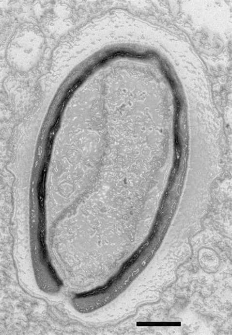 | Le Pandoravirus Quercus vu au microscope électronique photographié le 11 octobre 2017 au laboratoire Information génomique et structurale de Marseille. |