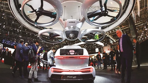 | Plusieurs prototypes de voitures volantes ont déjà été dévoilés comme le "Pop.up next" de Audi, italdesign et Airbus ici au Salon auto de Genève, en mars 2018. |