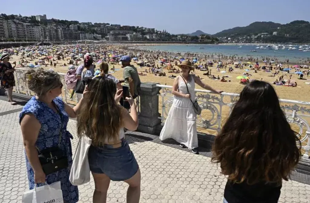 | Des touristes prennent des photos sur l'esplanade longeant la plage de la baie de La Concha, dans la ville basque espagnole de Saint-Sébastien, le 10 août 2025. |