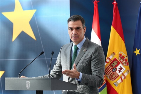 | Le chef du gouvernement espagnol Pedro Sánchez en conférence de presse, le 20 novembre à Agoncillo. |
