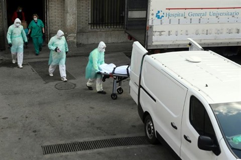 | Une personne décédée du COVID-19 est évacuée de l'hôpital de Gregorio Maranon à Madrid, le 25 mars. |