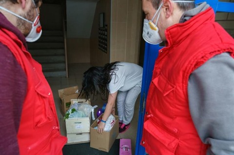 | Des bénévoles livrent des repas à domiciles aux personnes seules et âgées à Burgos, le 26 mars. |