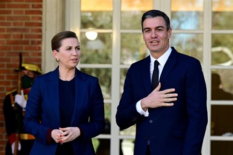 | La Première ministre danoise Mette Frederiksen au côté de son homologue espagnol Pedro Sanchez, le 21 février à Madrid |