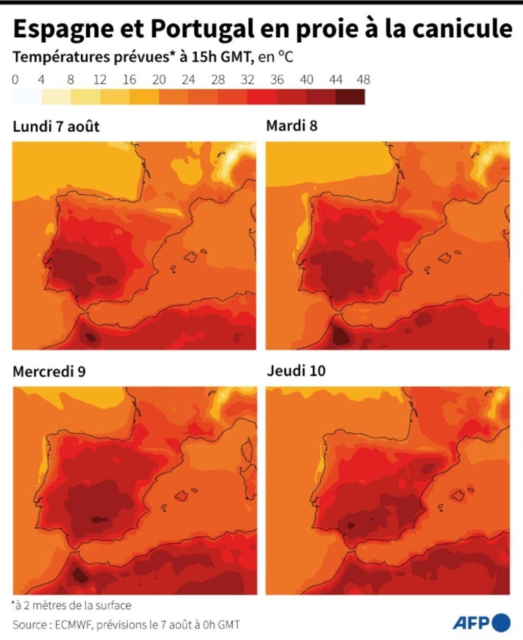 En Espagne, plusieurs provinces d'Andalousie (Sud), de Castille-La Manche (Centre) et d'Estrémadure (Ouest) ont été placées en vigilance orange, avec des températures pouvant atteindre 43°C lundi 7 août, selon l'Agence météorologique nationale (Aemet).