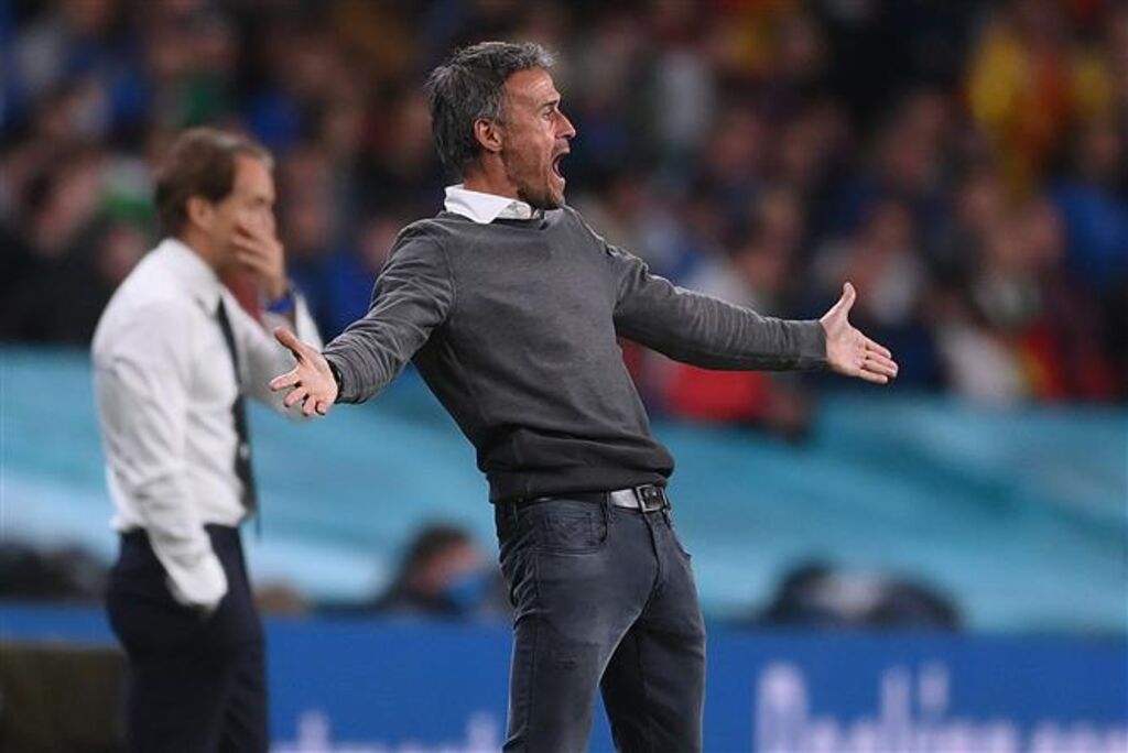| L'entraîneur espagnol Luis Enrique (droite) lors de la demi-finale de l'Euro 2020 au stade de Wembley, à Londres, le 6 juillet 2021. |