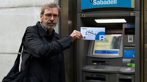 | Un homme montre un enveloppe contenant 155 euros, qu'il vient de retirer d'une banque en signe de protestation contre le gouvernement espagnol, à Barcelone, le 20 octobre. |