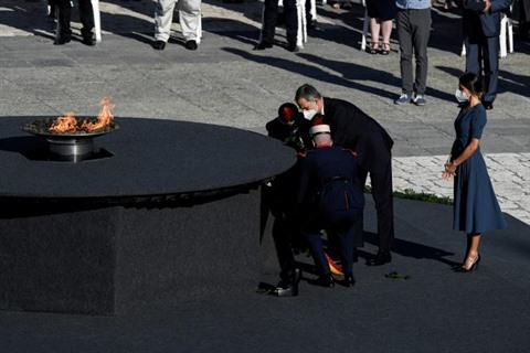 | Le roi d'Espagne Felipe VI, accompagné de son épouse la reine Letizia (droite), dépose un couronne devant une flamme rendant hommage aux mort du COVID, devant le palais royal à Madrid, le 15 juillet. |