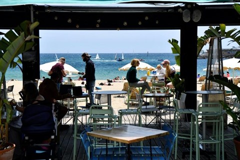 Des gens assis à la terrasse d'un bar au bord d'une plage de Barcelone, le 6 juin. Photo : AFP/VNA/CVN |