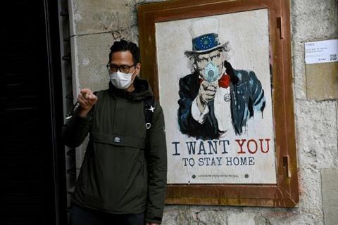 | Poster réalisé par l'artiste TVBoy, "Je veux que tu restes chez toi", à Barcelone le 14 mars. |