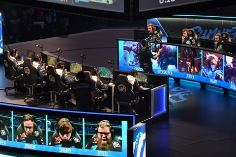 | Team Liquid contre Cloud9 lors de la finale de la Ligue nord-américaine de League of Legends, en septembre 2018 à Oakland. |