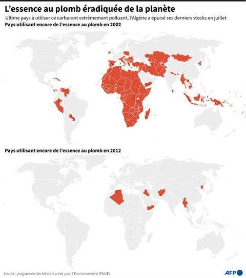 | Cartes du monde montrant la progression de l'interdiction de l'essence au plomb après que le dernier pays, l'Algérie, a arrêté de l'utiliser en juillet. |