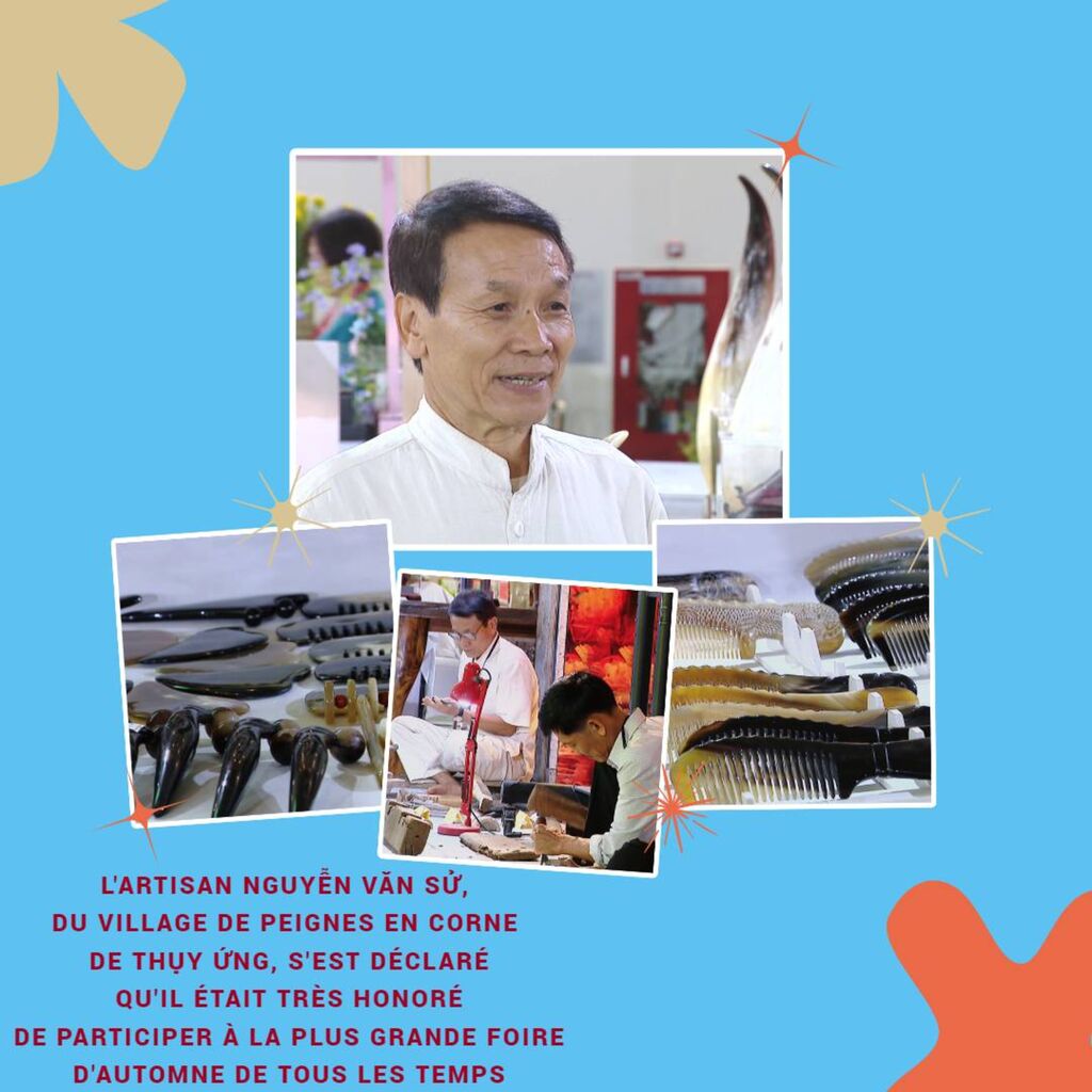 L'artisan Nguyễn Văn Sử, du village de peignes en corne de Thụy Ứng s'est déclaré qu'il est très honoré de participer à la plus grande Foire d'automne de tous les temps. "À cette occasion, nous présentons les produits spéciaux de notre village et nous guidons les visiteurs à travers la découverte et la fabrication de leurs propres produits, pour qu’ils comprennent mieux les spécificités uniques de notre métier", a révélé-t-il.