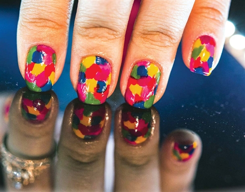 | Une femme montre ses doigts colorés pendant la Semaine de la mode des ongles. |