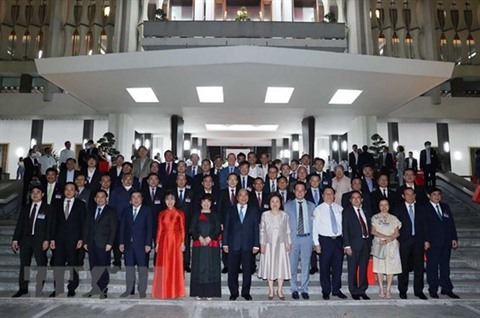 | Le Premier ministre Nguyên Xuân Phuc (1er plan, centre) et des hommes d'affaires et intellectuels à Hô Chi Minh-Ville. |