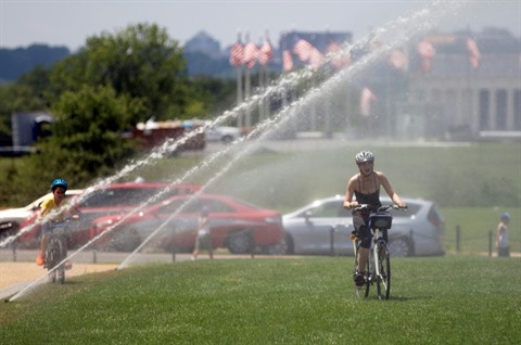 | Des cyclistes roulent sous les jets d'une fontaine à Washington le 19 juillet. |
