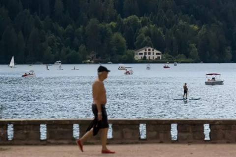 | Un homme marche le long du lac de Gérardmer, dans l'est de la France, le 3 août, alors que le niveau d'eau du lac a baissé suite à une vague de chaleur. |