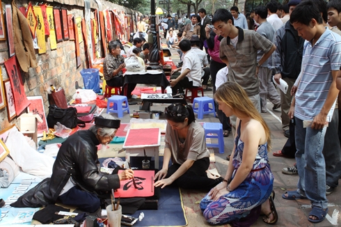| Une touriste russe à la découverte de l’art calligraphique du Vietnam au Temple de la Littérature (Hanoi). |