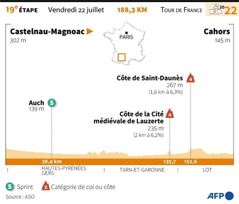 | Profil de la 19e étape du Tour de France 2022 entre Castelnau-Magnoac et Cahors, le vendredi 22 juillet. |